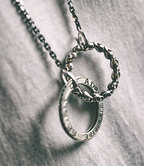 United forever – two rings are inseparably joined together on a necklace of blackened 925 Sterling s...